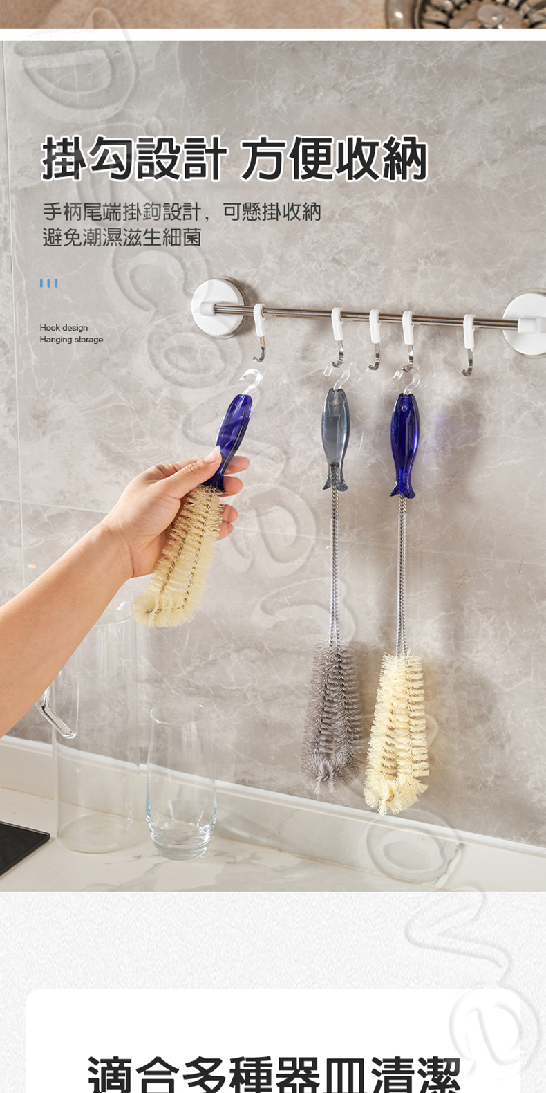 特色:刷桿堅固不彎曲、柔韌刷毛、尾端掛勾收納