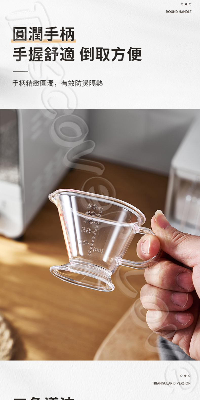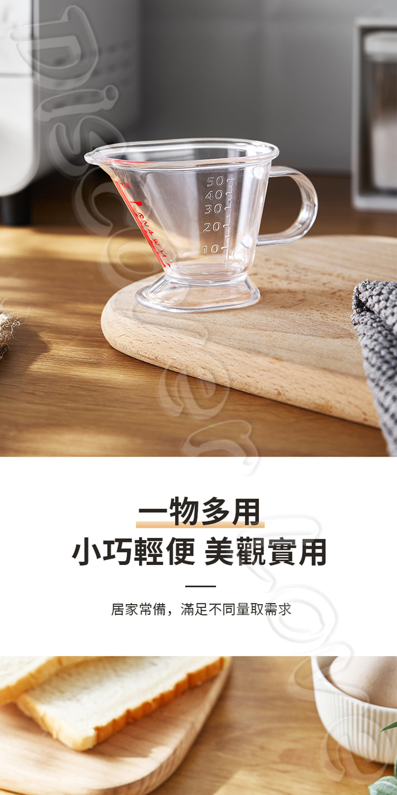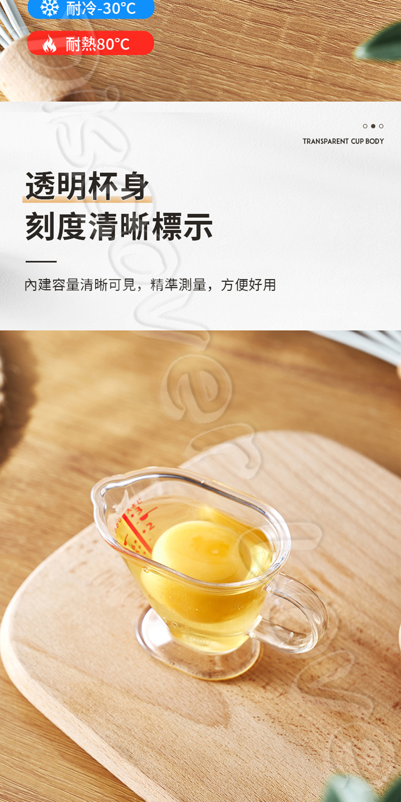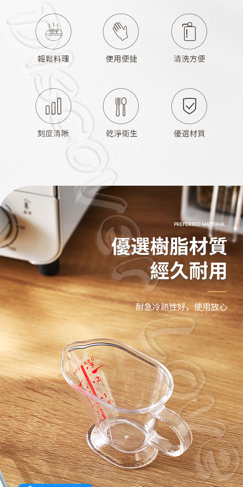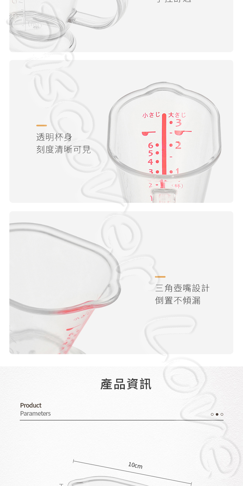 特色:透明刻度清晰、耐摔、輕巧、帶把手設計